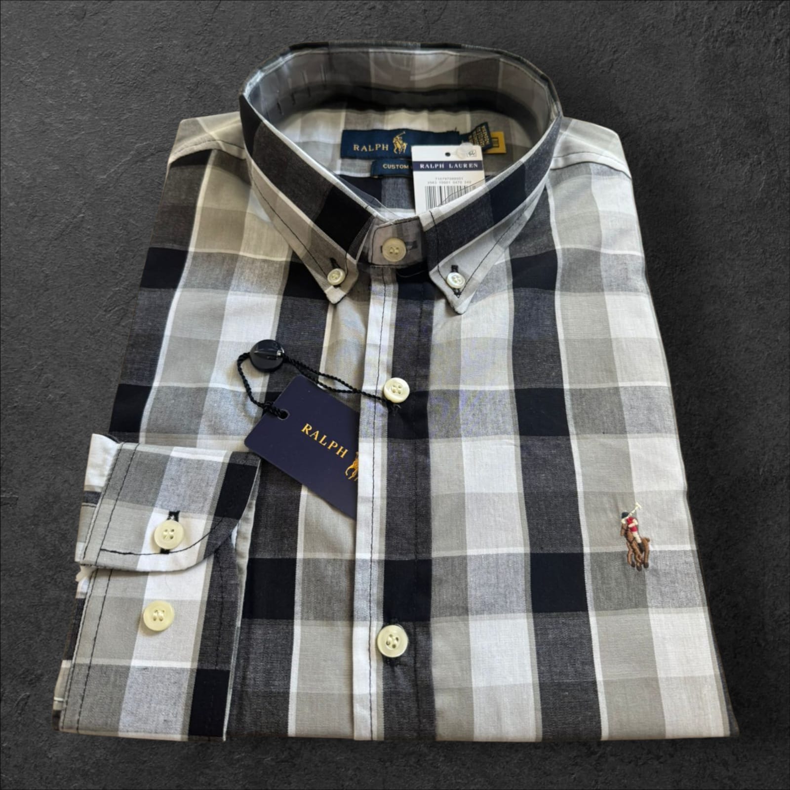 Camisa Xadrez Ralph Lauren Masculina Custom Fit Preto e Cinza